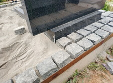 Заранее просыпав площадь места захоронения пескобетонной смесью начинаем строгими рядами укладывать брусчатку.