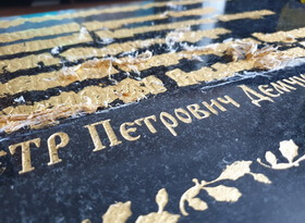 Саму гравировку мы выполнили при помощи пескоструйного аппарата и сразу же принялись за покрытие текста сусальным золотом. Начали с орнамента, так как работать с элементами декора проще, чем с печатным текстом.