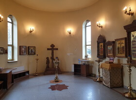 На момент нашего посещения, в храме уже находилась небольшая табличка – она была размещена неподалёку от креста и смотрелась композиция, прямо говоря, не лучшим образом. Надписи мелкие, практически не читаемые, да и сам мрамор, даже находясь в закрытом помещении, потускнел и утратил презентабельный вид.